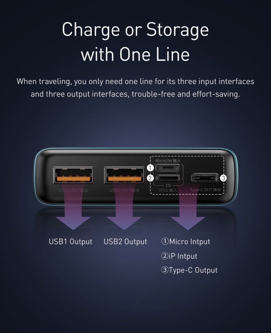 - Ngỏ vào: được trang bị 3 cổng sạc ngỏ vào gồm Lightning, Micro và Type C. Trong đó cổng Type C hỗ trợ sạc nhanh đồng thời cả in và out (Bi-directional quick charging). Việc trang bị cả 3 cổng sạc ngỏ vào cho phép bạn bạn có thể sạc cho pin bằng chính cáp của điện thoại mà không cần trang bị thêm cáp sạc riêng.