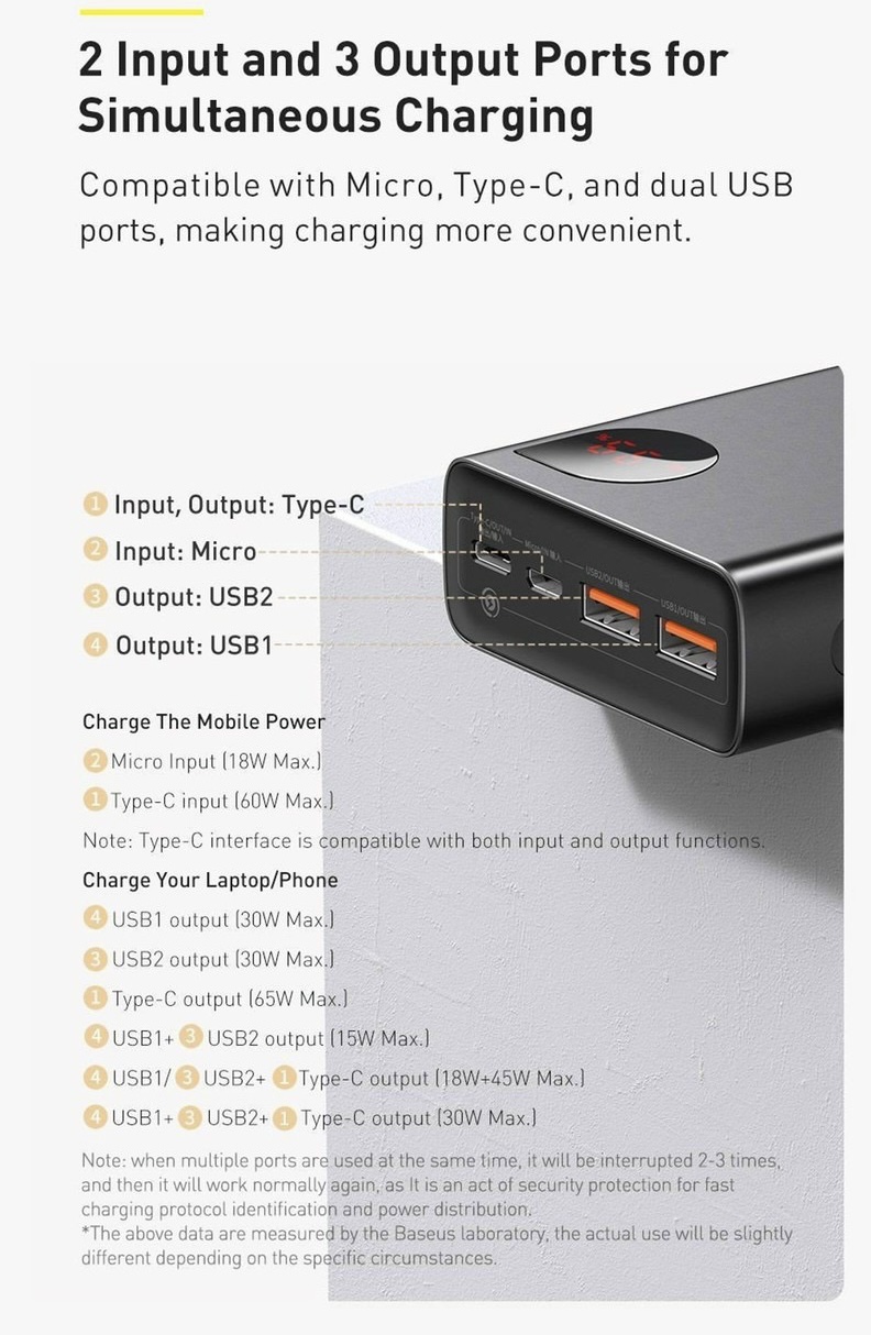 - Sản phẩm có dung lượng pin lớn, công suất, hiệu suất sử dụng cao (lên đến 65W) có 3 port (2 USB + 1 Type C). Cả 3 Port này đều hỗ trợ sạc nhanh (QC3.0 và PD3.0) , có thể dùng sạc pin cho cả 3 thiết bị cùng lúc. Giúp bạn sử dụng thoải mái hơn và quên đi nổi lo hết pin khi đi công tác, du lịch, giả ngoại ... Giúp cho mọi thiết bị của bạn luôn trong tình trạng sẳn sàng sử dụng .