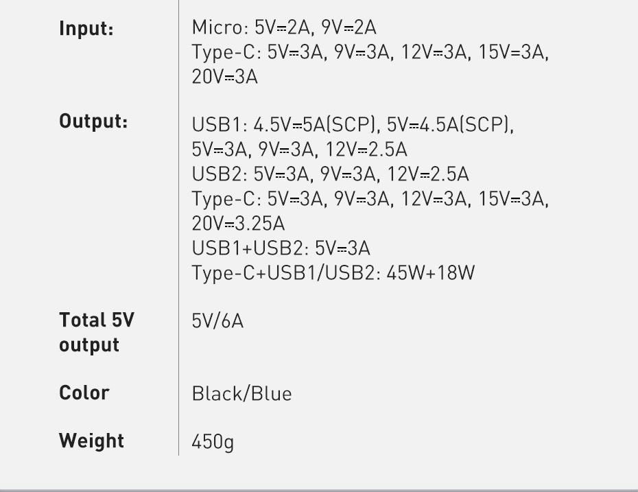 Type-C+USB1/USB2 : 45W+18W Total 5V output : 5V/6A