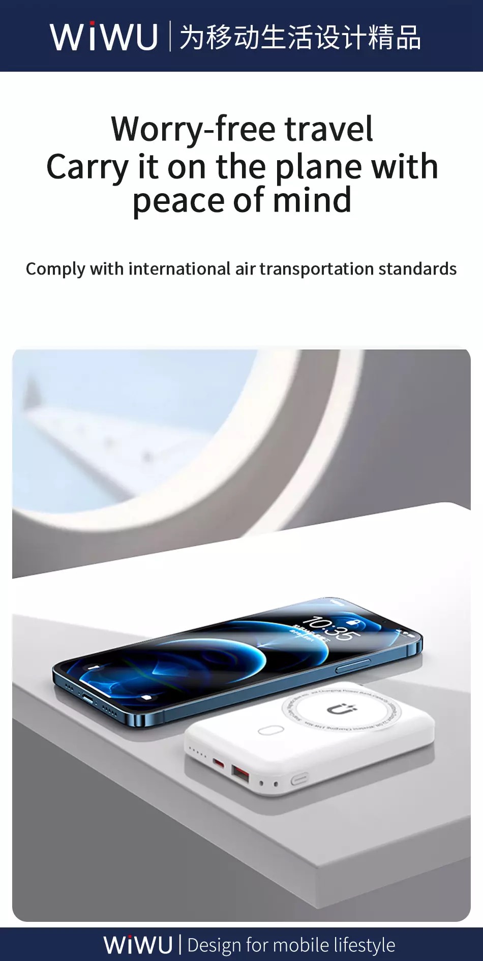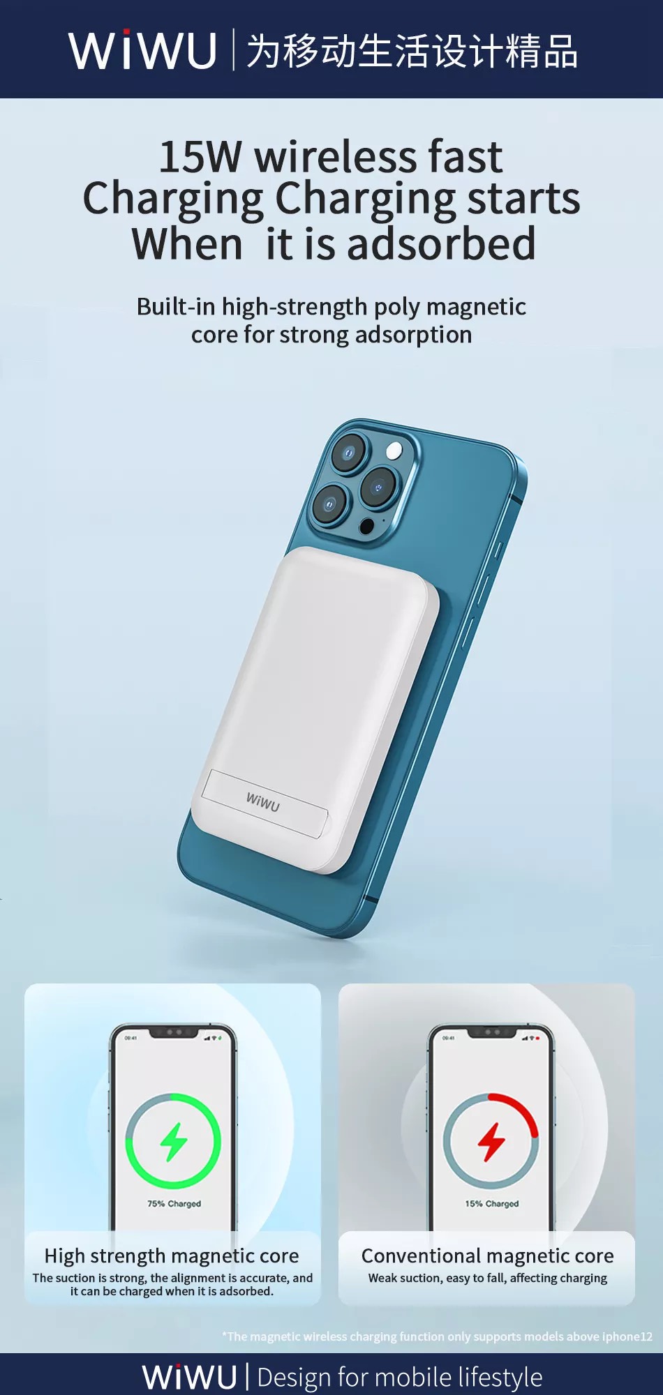 Sạc dự phòng Magsafe Battery Pack của wiwu cho IPhone 13 Series , IPhone 12 Series được thiết kế tương tự của Apple khi lắp vào lưng sẽ không bị vướng camera tốc độ sạc không dây tối da cho Phép là 15W sạc nhanh.