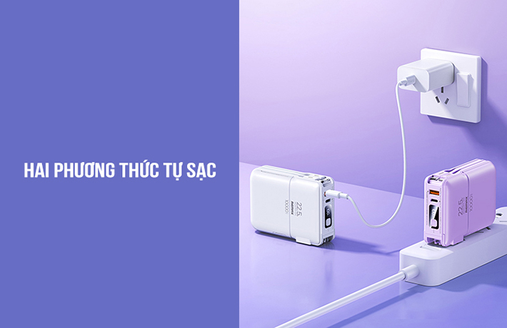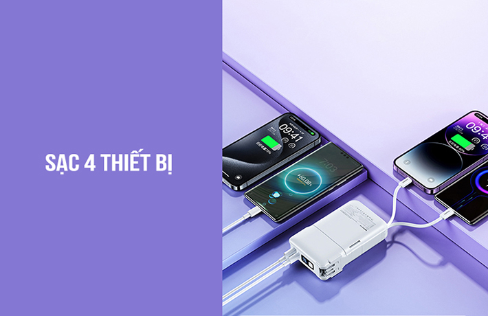 Pin dự phòng có 2 cổng sạc USB và Type C, kết hợp 2 cáp sạc đi kèm giúp người dùng có thể sạc cùng lúc 4 thiết bị. Hai đầu sạc này có tổng công suất tối đa lên đến 22.5W và được trang bị công nghệ sạc nhanh QC + PD giúp sạc nhanh và tiết kiệm thời gian hơn.