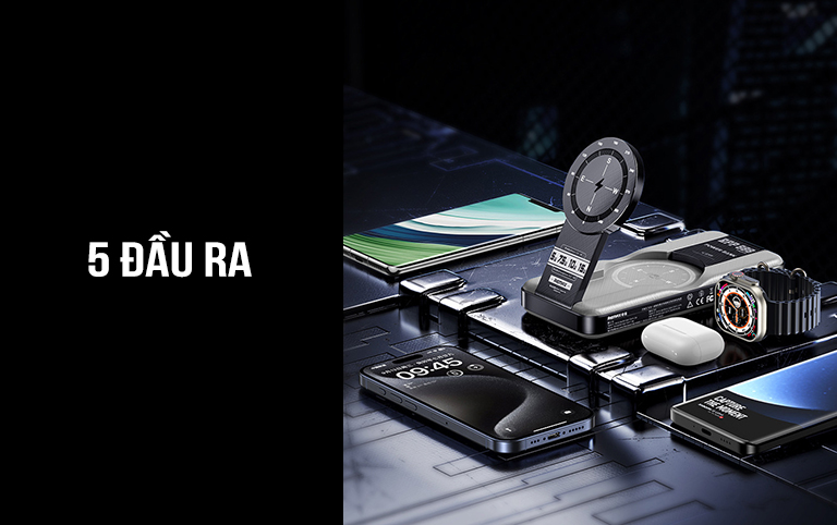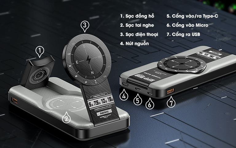 Remax RPP-589 được nhà sản xuất trang bị 2 cổng sạc gồm 1 cổng USB Output, 1 cổng Type C In/Output và 1 cổng Micro Input. Kết hợp với đế sạc không dây, pin dự phòng có tới 5 đầu ra hỗ trợ người dùng sạc nhiều thiết bị vô cùng tiện lợi.