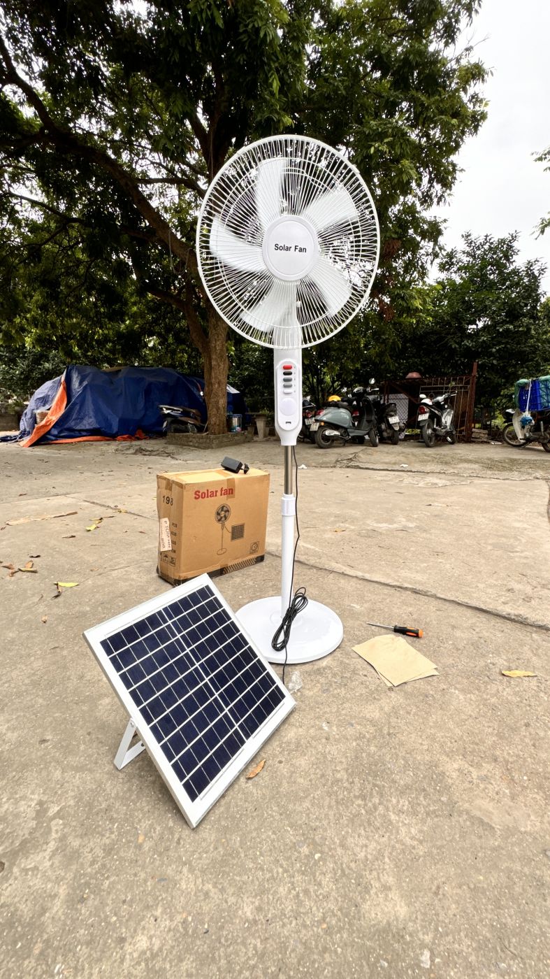 Ban ngày không cần cắm điện, cứ để panel ra chỗ có ánh năng là quạt chạy cả ngày không cần điện luôn. Hoặc có thể cắm thẳng điện 220v để sạc pin & sử dụng bình thường.