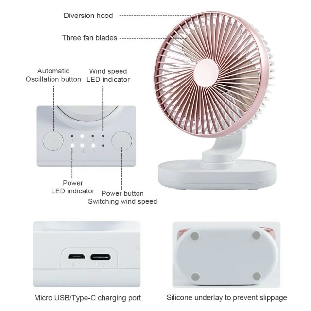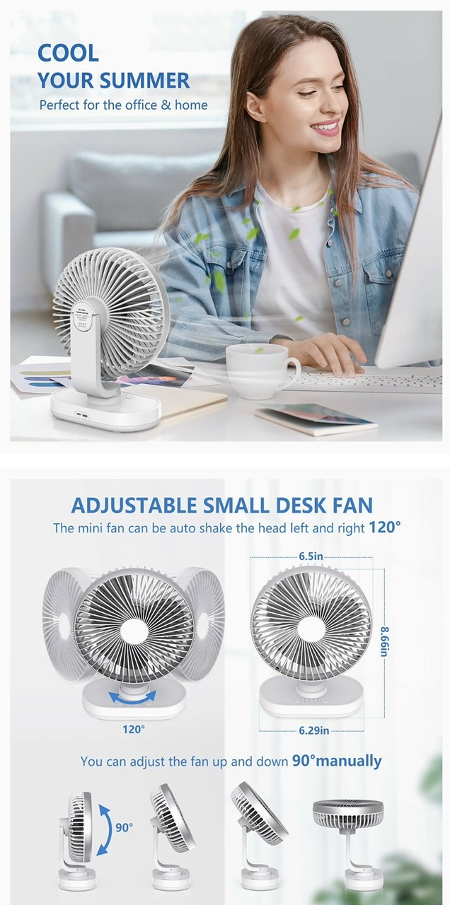 Điều chỉnh linh hoạt: Quạt bàn USB này có thể tự động xoay sang trái và phải 120 ° và có thể điều chỉnh đầu quạt lên xuống 90 °.