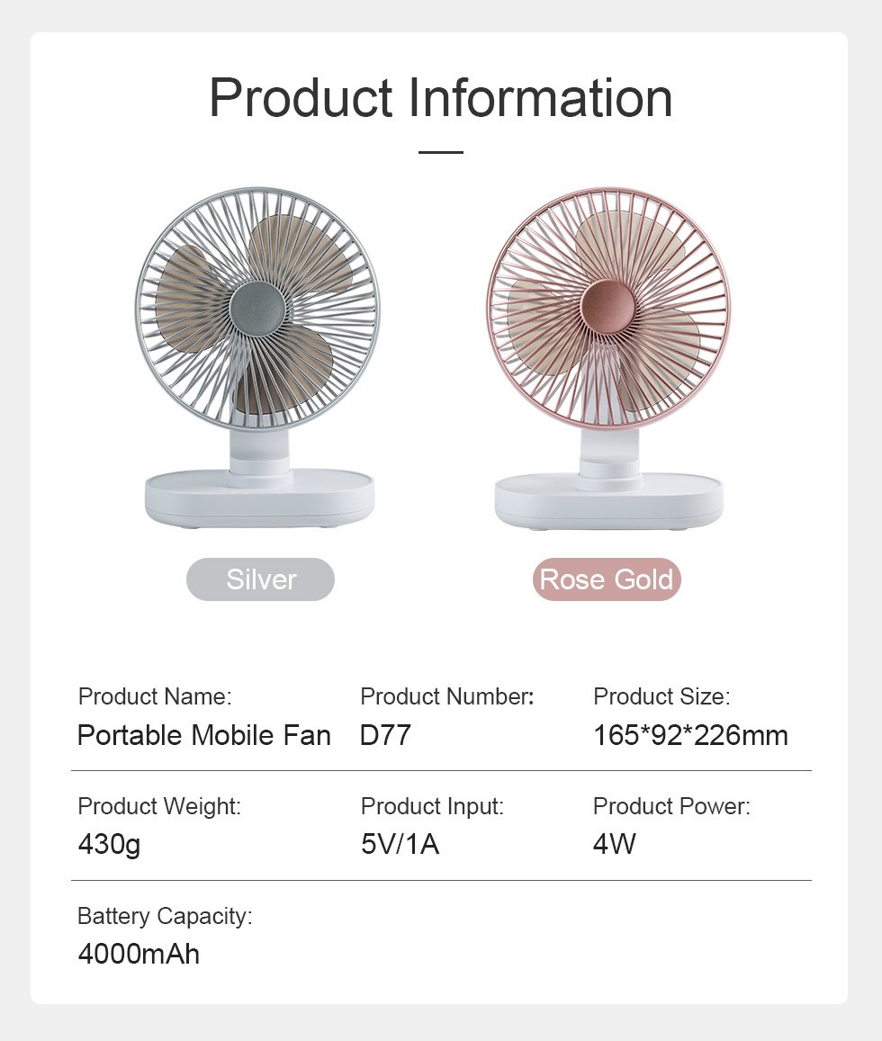 Pin dung lượng cao: Quạt bàn D77 với pin sạc lithium 4000Mah, Bạn có thể sử dụng hơn 8,5-16 giờ trong một lần sạc.