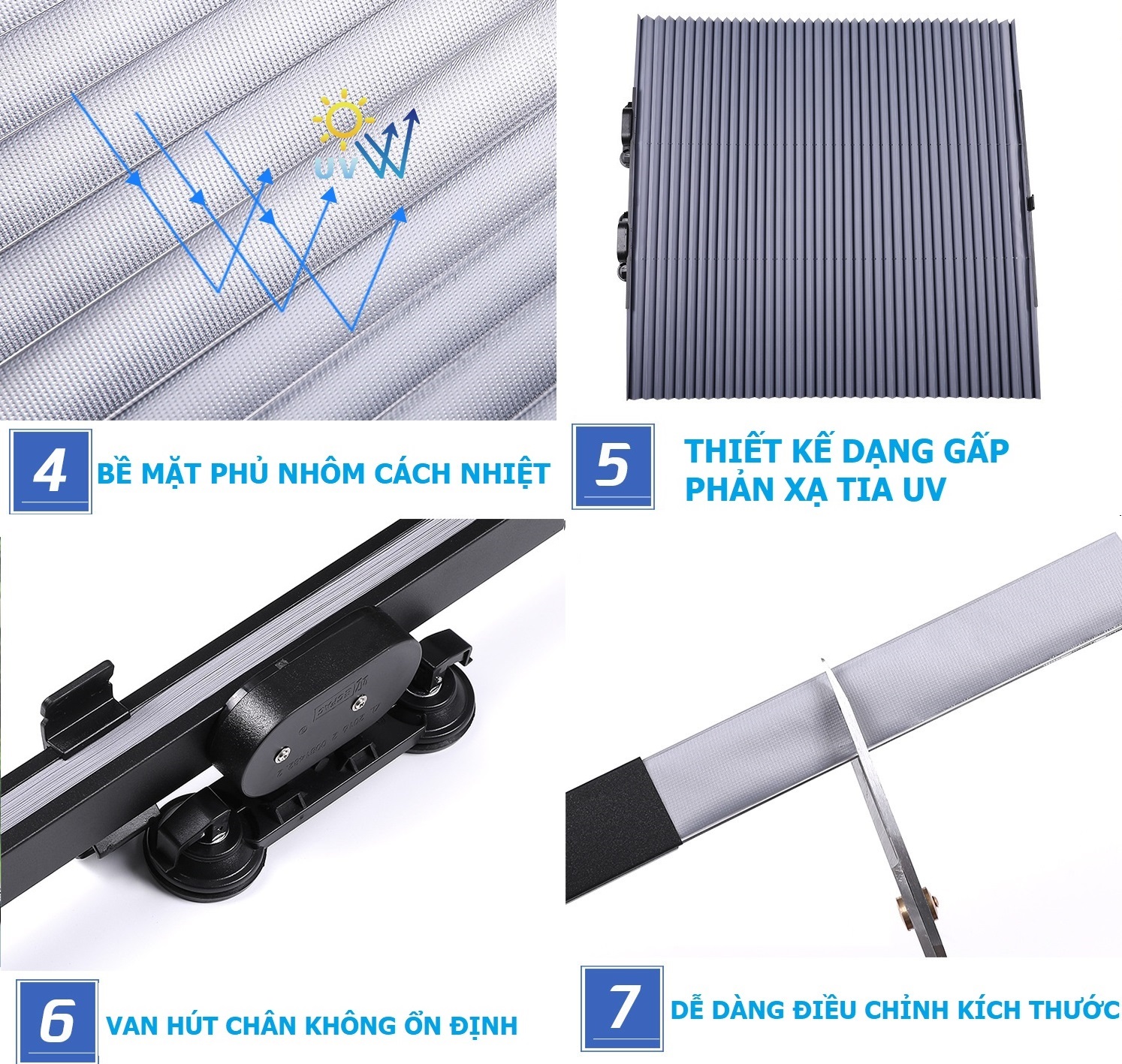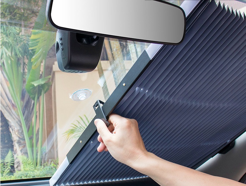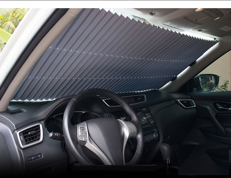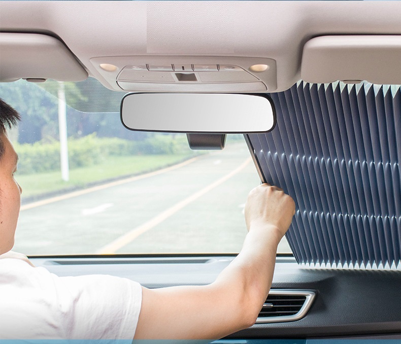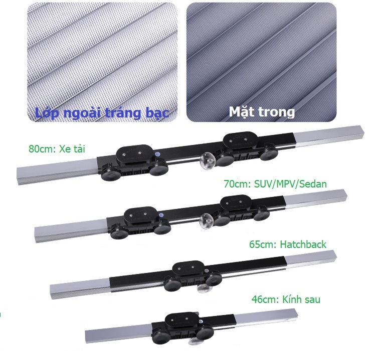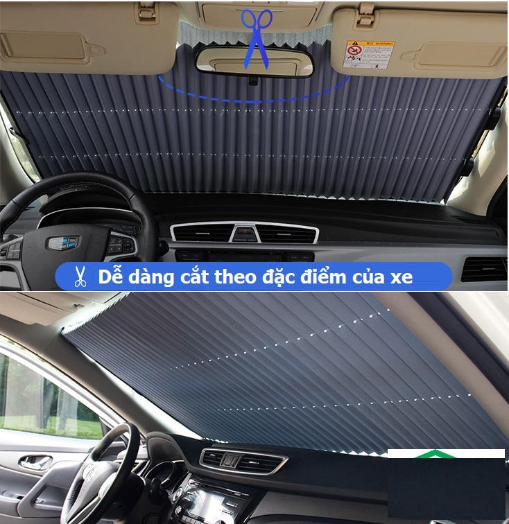 Rèm chắn nắng cho kính lái xe ô tô thiết kế dạng rèm kéo, cấu tạo gồm các lá nhôm phủ vào vải polyester cao cấp và dày. Dùng được cả ở kính lái và kính hậu với hiệu quả chống nắng thì tuyệt vời, nhiệt độ giảm hơn 2/3 so với không dùng. Với cốc hút chân không cải tiến giúp hút chặt vào kính lái, một đầu cố định, một đầu di chuyển khiến việc đóng mở chỉ mất 2-3s, cực kỳ tiện lợi.