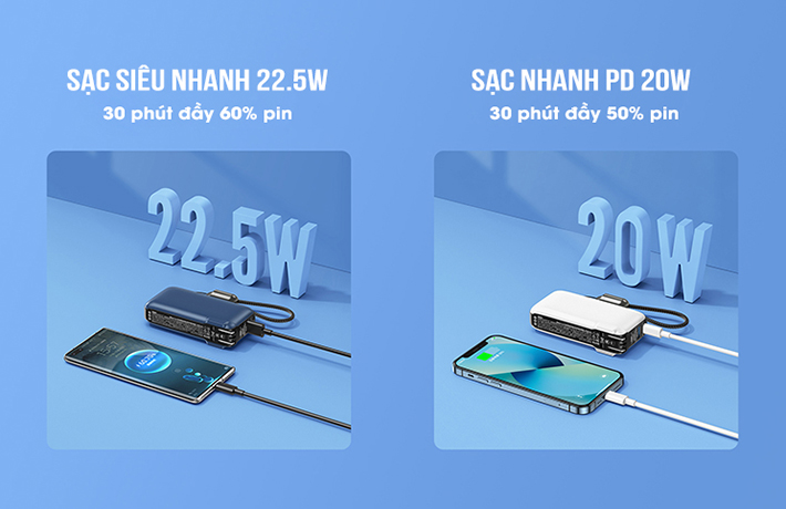 Sạc dự phòng đa năng Remax RPP-278 có 2 cổng Output là USB và Type C đều được tích hợp công nghệ sạc nhanh tương ứng QC và PD. Theo thông tin từ nhà sản xuất, với công suất 22.5W người dùng có thể nạp đầy 60% pin chỉ trong 30 phút. Còn với công suất 20W người dùng có thể nạp đầy 50% pin chỉ trong 30 phút.