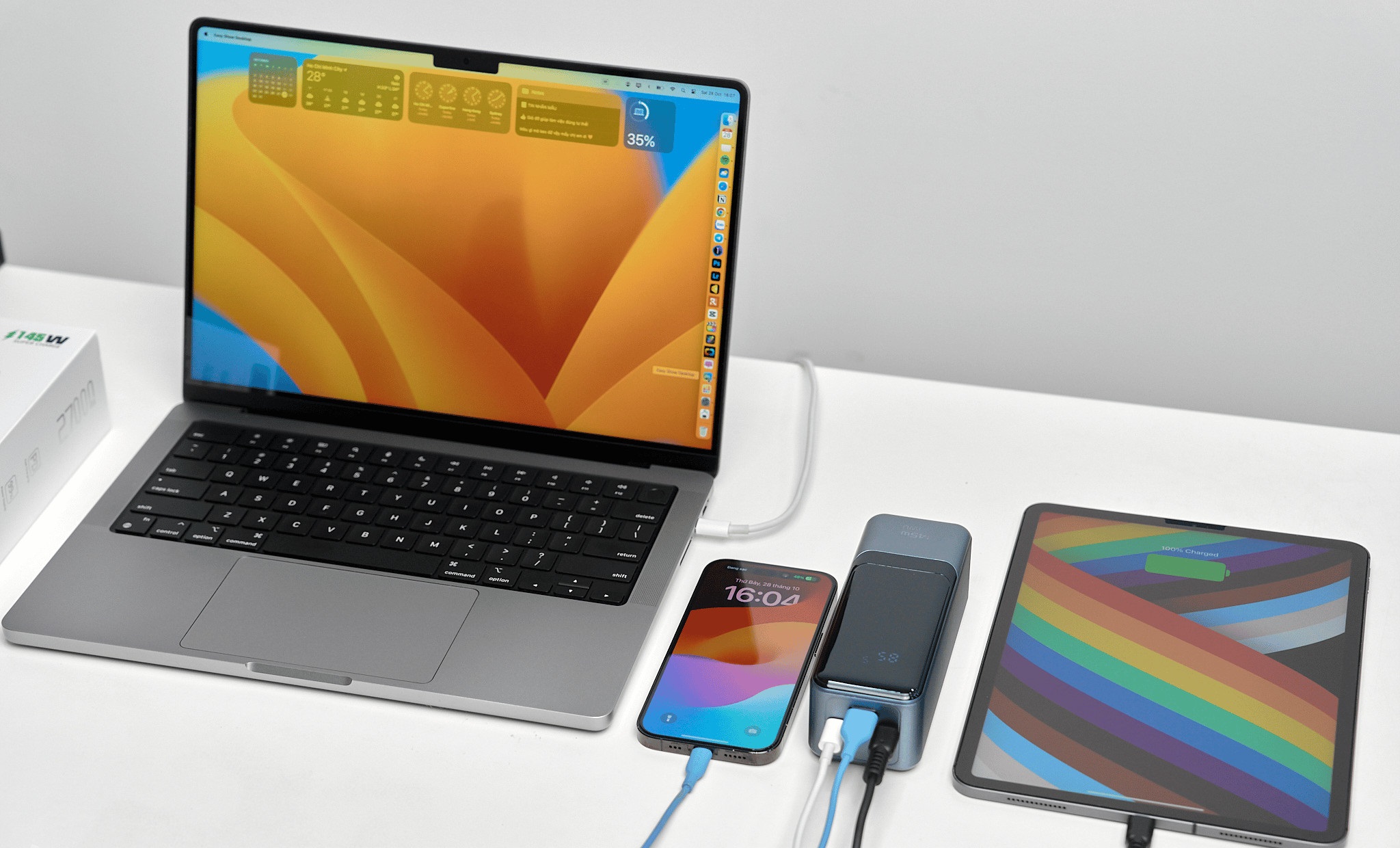 Sạc dự phòng MB có thể sạc lên đến 145W, 3 cổng tương thích nhiều thiết bị, tiết kiệm thời gian nhanh chóng. Dễ dàng mang đi ra ngoài cho những công việc gấp rút, sạc nhanh MB Pro 14 inch 50% trong 30 phút.
