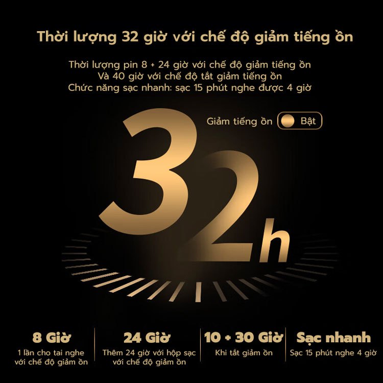 Thời gian nghe nhạc lên đến 40 giờ nếu không bật chế độ giảm tiếng ồn và 32 giờ nếu bật chế độ giảm tiếng ồn.