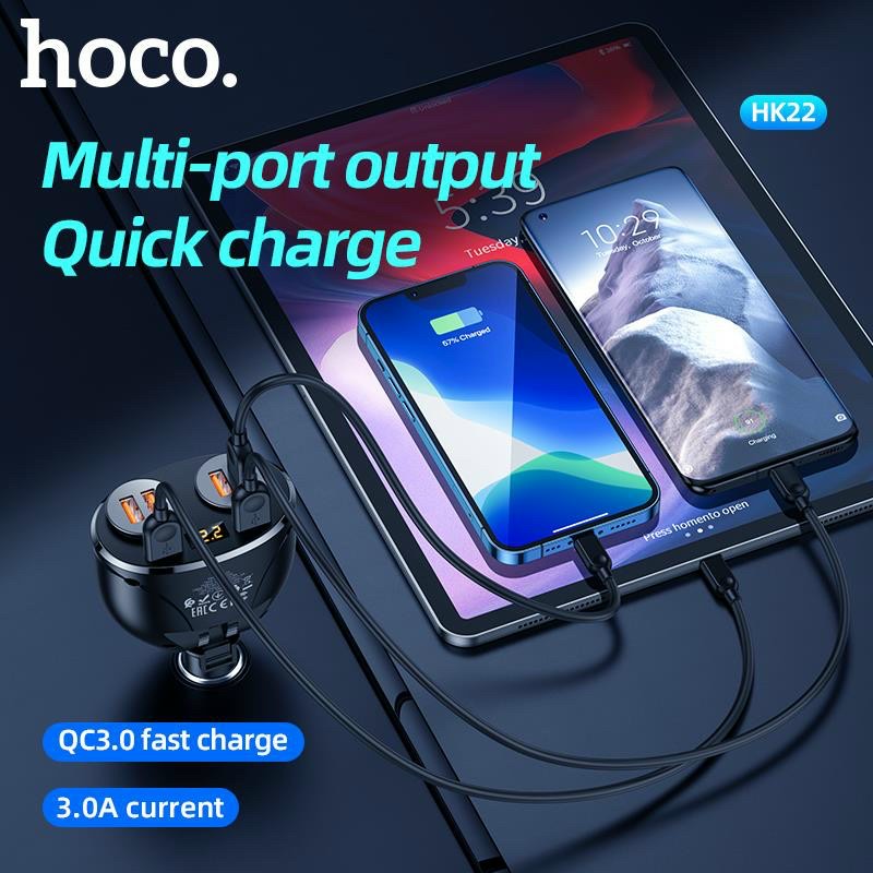Điểm nổi bật nhất trên sạc nhanh ô tô QC 3.0 Hoco HK22chính là việc được trang bị thêm 2 ổ cắm có thể gắn thêm 2 đầu sạc, giúp bạn có thể sạc cùng lúc 6 chiếc điện thoại với tốc độ cao nhất hay sử dụng với nhiều thiết bị khác như camera hành trình, máy hút bụi, bơm hơi ô tô,...