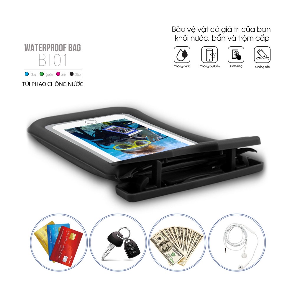 - Túi hơi chống nước, chống chìm đa năng Titan BT01 cho iPhone, Samsung được làm bằng nhựa dẻo (PVC) và sợi nylon cao cấp giúp cho túi có tính đàn hồi cao và độ bền cực tốt. Có thể sử dụng cho nhiều loại điện thoại khác nhau với kích thước màn hình từ 6 inch trở xuống.