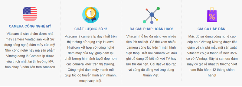 Vitacam là dòng camera ip sử dụng công nghệ truyền hình ảnh đám mây của Mỹ dựa trên công nghệ của hãng camera ip Vimtag thương hiệu camera yêu thích nhất tại thị trường Mỹ.